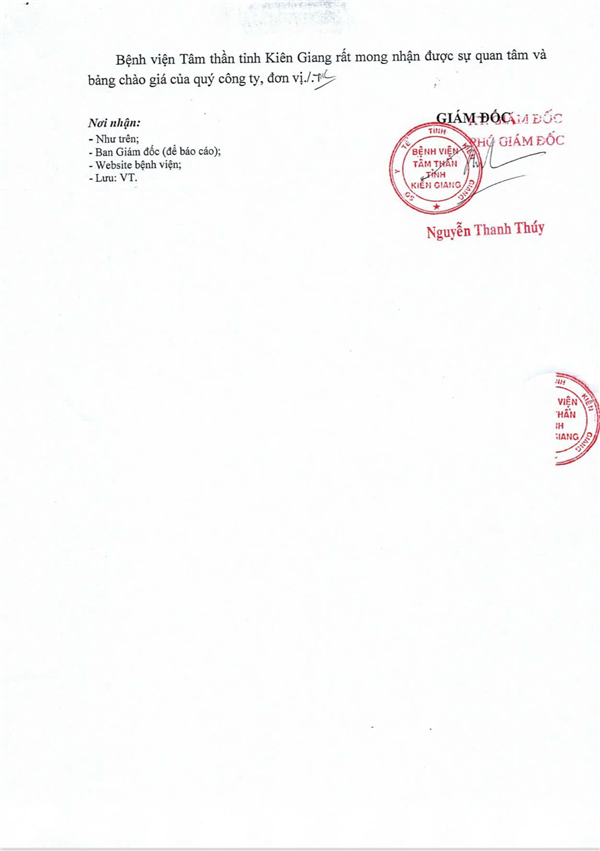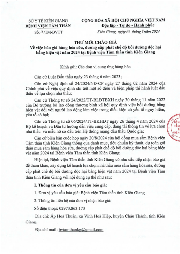 - (24/11/2025 03:39:00 PM) - THƯ MỜI CHÀO GIÁ V/v Báo giá hàng hóa đường, sữa các loại cấp phát bồi dưỡng độc hại bằng hiện vật năm 2025 tại Bệnh viện Tâm thần Kiên Giang)